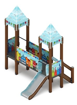 Спаренная башня из шести клеёных брусьев 100х100 мм высота 2500 мм-4 шт и 1500 мм- 2 шт; полы из ламинированной фанеры, с анти-скользящим покрытием 780х780мм толщиной 18мм. Башня украшена стилизованными декоративными арками (780х330х18мм) и четырехскатной крышей, крыша поставляется в сборе и выполнена из влагостойкой фанеры толщиной 12 мм (габариты в сборе 770х770х740мм), кромки фанеры тщательно шлифованы, окрашены с нанесением принта. Отметка пола башни от планировочной отметки площадки 900мм и 750мм. |