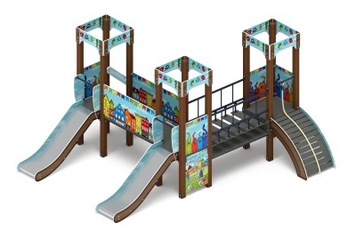 Выполнена из четырёх клеёных брусьев, окрашенных в коричневый цвет, сечением 100х100 мм и высотой 2500 мм. Пол из ламинированной фанеры с антискользящим покрытием размером 780х780 мм толщиной 18 мм. Башня без крыши, украшена стилизованными декоративными арками, кромки фанеры тщательно шлифованы, окрашены с нанесением принта. Отметка пола башни от планировочной отметки площадки 750 мм |