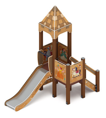 Выполнена из четырёх клеёных брусьев, окрашенных в коричневый цвет, сечением 100х100 мм и высотой 2500 мм. Пол из ламинированной фанеры с антискользящим покрытием размером 780х780 мм толщиной 18 мм. Башня без крыши, украшена стилизованными декоративными арками, кромки фанеры тщательно шлифованы, окрашены с нанесением принта. Отметка пола башни от планировочной отметки площадки 750 мм |