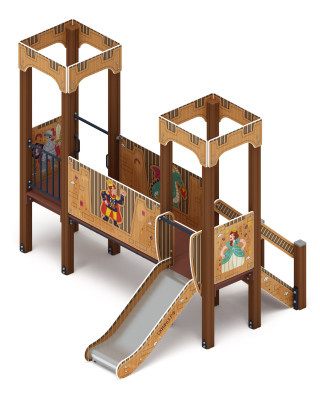 Выполнена из четырёх клеёных брусьев, окрашенных в коричневый цвет, сечением 100х100 мм и высотой 2500 мм. Пол из ламинированной фанеры с антискользящим покрытием размером 780х780 мм толщиной 18 мм. Башня украшена стилизованными декоративными арками (780х330х18мм) и четырехскатной крышей, крыша поставляется в сборе и выполнена из влагостойкой фанеры толщиной 12 мм (габариты в сборе 770х770х740мм), кромки фанеры тщательно шлифованы, окрашены с нанесением принта. Крыша поставляется в сборе Отметка пола башни от планировочной отметки площадки 750 мм |