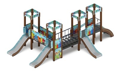 Выполнена из четырёх клеёных брусьев, окрашенных в коричневый цвет, сечением 100х100 мм и высотой 2500 мм. Пол из ламинированной фанеры с антискользящим покрытием размером 780х780 мм толщиной 18 мм. Башня без крыши, украшена стилизованными декоративными арками, кромки фанеры тщательно шлифованы, окрашены с нанесением принта. Отметка пола башни от планировочной отметки площадки 900 мм |