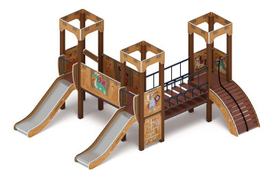 Выполнена из четырёх клеёных брусьев, окрашенных в коричневый цвет, сечением 100х100 мм и высотой 2500 мм. Пол из ламинированной фанеры с антискользящим покрытием размером 780х780 мм толщиной 18 мм. Все башни украшены стилизованными декоративными арками (780х330х18мм) и две дополнительно четырехскатной крышей, крыша поставляется в сборе и выполнена из влагостойкой фанеры толщиной 12 мм (габариты в сборе 770х770х740мм), кромки фанеры тщательно шлифованы, окрашены с нанесением принта. Отметка пола башни от планировочной отметки площадки 900 мм |