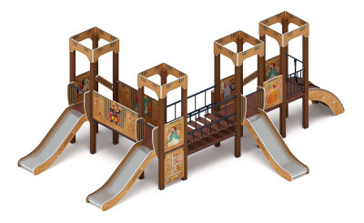 Выполнена из четырёх клеёных брусьев, окрашенных в коричневый цвет, сечением 100х100 мм и высотой 2500 мм. Пол из ламинированной фанеры с антискользящим покрытием размером 780х780 мм толщиной 18 мм. Все башни украшены стилизованными декоративными арками (780х330х18мм) и две башни дополнительно четырехскатной крышей, крыша поставляется в сборе и выполнена из влагостойкой фанеры толщиной 12 мм (габариты в сборе 770х770х740мм), кромки фанеры тщательно шлифованы, окрашены с нанесением принта. Отметка пола башни от планировочной отметки площадки 900 мм |