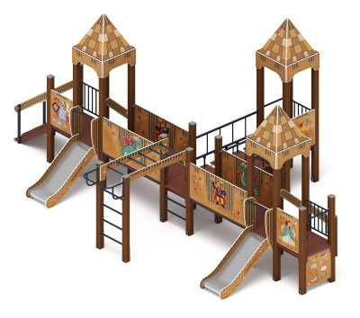 Выполнена из четырёх клеёных брусьев, окрашенных в коричневый цвет, сечением 100х100 мм и высотой 2500 мм. Пол из ламинированной фанеры с антискользящим покрытием размером 780х780 мм толщиной 18 мм. Башня без крыши, украшена стилизованными декоративными арками, кромки фанеры тщательно шлифованы, окрашены с нанесением принта. Отметка пола башни от планировочной отметки площадки 900 мм |