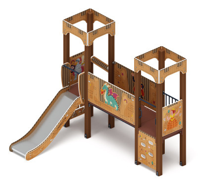 Выполнена из четырёх клеёных брусьев, окрашенных в коричневый цвет, сечением 100х100 мм и высотой 2500 мм. Пол из ламинированной фанеры с антискользящим покрытием размером 780х780 мм толщиной 18 мм. Башня украшена стилизованными декоративными арками (780х330х18мм) и четырехскатной крышей, крыша поставляется в сборе и выполнена из влагостойкой фанеры толщиной 12 мм (габариты в сборе 770х770х740мм), кромки фанеры тщательно шлифованы, окрашены с нанесением принта. Отметка пола башни от планировочной отметки площадки 900 мм |