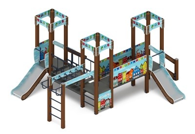 Выполнена из четырёх клеёных брусьев, окрашенных в коричневый цвет, сечением 100х100 мм и высотой 2500 мм. Пол из ламинированной фанеры с антискользящим покрытием размером 780х780 мм толщиной 18 мм. Башня без крыши, украшена стилизованными декоративными арками, кромки фанеры тщательно шлифованы, окрашены с нанесением принта. Отметка пола башни от планировочной отметки площадки 900 мм |