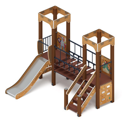 Выполнена из четырёх клеёных брусьев, окрашенных в коричневый цвет, сечением 100х100 мм и высотой 2500 мм. Пол из ламинированной фанеры с антискользящим покрытием размером 780х780 мм толщиной 18 мм. Башня украшена стилизованными декоративными арками (780х330х18мм) и четырехскатной крышей, крыша поставляется в сборе и выполнена из влагостойкой фанеры толщиной 12 мм (габариты в сборе 770х770х740мм), кромки фанеры тщательно шлифованы, окрашены с нанесением принта. Отметка пола башни от планировочной отметки площадки 900 мм |