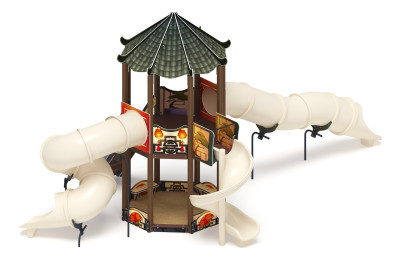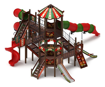 Две восьмигранные башни выполнены из восьми клеёных брусьев, окрашенных в коричневый цвет, не более 100х100 мм, высотой 4000 мм и 3000 мм. Пол из ламинированной фанеры, с анти-скользящим покрытием, состоящий из части пола размером 800х2320 мм и двух частей размером 760х2136 мм толщиной 18 мм. Башни имеют крышу. Крыша состоит из скатов крыши из фанеры 12 мм, скаты опираются на арки из фанеры 18 мм. Башня по периметру украшена щитами-ограждениями из фанеры толщиной 18 мм размером 800х720мм, кромки фанеры тщательно шлифованы, фанера окрашена с нанесением принта «Шапито». Отметка пола первой башни от планировочной отметки площадки 2000 мм. Габарит башни 2860х2860х5100 (h) Отметка пола второй башни от планировочной отметки площадки 1200 мм. Габарит башни 2860х2860х4100 (h) Две малые башни выполнены из четырёх клеёных брусьев, окрашенных в коричневый цвет, сечением 100х100мм высотой 2500 мм. Пол из ламинированной фанеры толщиной 18 мм с анти-скользящим покрытием размером 1000х1000 мм. Башни украшены декоративным куполом из перекладин, перекладины из труб диаметром 27 мм. Габарит башен 1000х1000х3280(h). Отметка пола от план. отм. площадки 1200 мм. |