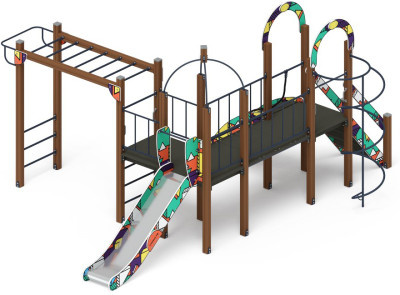 1 | Башни | Спаренная башня из шести клеёных брусьев 100х100 мм высота 2500 мм полы из ламинированной фанеры, с антискользящим покрытием 1000х1900 мм толщиной 18 мм. Одна башня украшена декоративным куполом из перекладин, перекладины из труб диаметром 27 мм Одиночная башня выполнена из четырёх клеёных брусьев не более 100х100 мм высота 2500 мм пол из ламинированной фанеры, с антискользящим покрытием 1000х1000 мм толщиной 18 мм над башней арки, разборная конструкция из двух полуарок, габарит 820х285х18 мм и накладки 225х140х18 мм, кромки фанеры тщательно шлифованы, фанера окрашена с нанесением принта - техно-голубой Размер башни с куполом и башни с арками 1000х1000х3280 (h), башня примыкающая к рукоходу 1000х900х2500 (h). Отметка пола башен от планировочной отм площадки 1200 мм | комплект | |