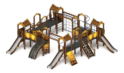 Башни выполнены из четырёх клеёных брусьев 100х100 мм высотой 2500 мм и 3000 мм полы из ламинированной фанеры с антискользящим покрытием 1000х1000 мм, толщиной 18 мм. Над четырьмя башнями имеется двух скатная крыша из фанеры толщиной 12 мм, размер 1000х575 мм. Над четырьмя другими башнями - арки, разборная конструкция из двух полуарок, габарит 500х342х18 мм и накладки 220х200х18 мм, кромки фанеры тщательно шлифованы, фанера окрашена с нанесением принта - мультяшный город. Размер башен 1000х1000х3000 (h)- с крышей - 3 шт 1000х1000х4000 (h)-с крышей и винтовой горкой -1 шт 1000х1000х2800 (h)-с аркой Отметка пола от планировочной отм. площадки 1200 мм Башня со спиральной горкой -2000 мм (высота свободного падения 2000 мм ) |