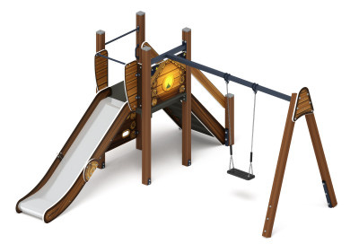 выполнена из четырёх клеёных брусьев 100х100 мм высота 2500 мм пол из ламинированной фанеры, с антискользящим покрытием 1000х1000 мм, толщиной 18 мм кромки фанеры тщательно шлифованы. Ограждение башни двух видов - из влагостойкой фанеры и ограждающая перекладина из стальной трубы. Ограждение из влагостойкой фанеры толщиной 18 мм, крепятся к опорному брусу при помощи пластиковых уголков. Ограждение окрашено при помощи UF-принтера. Принт - в стиле Мультяшный город.Отметка пола башни от планировочной отм площадки 1200 мм |